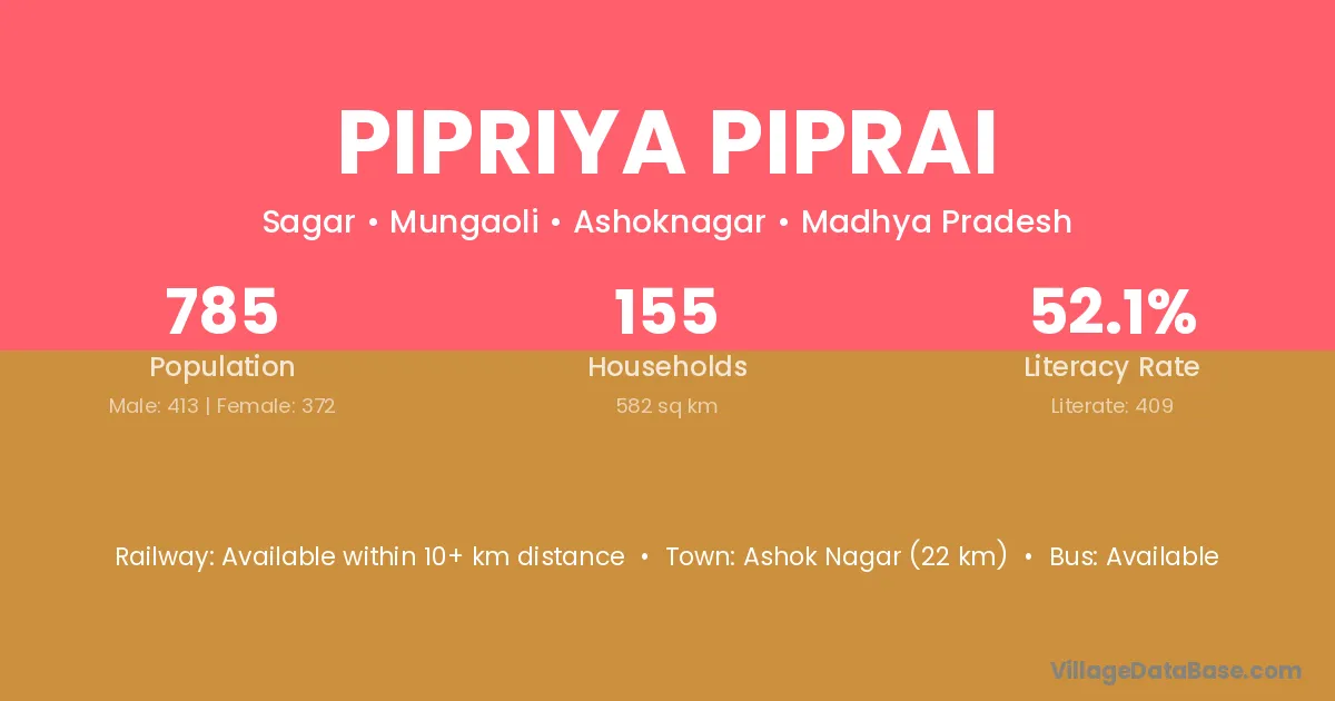 Ashok Nagar (22 km) is the nearest town to Pipriya Piprai village for major economic activities and is located approximately 22 km away.