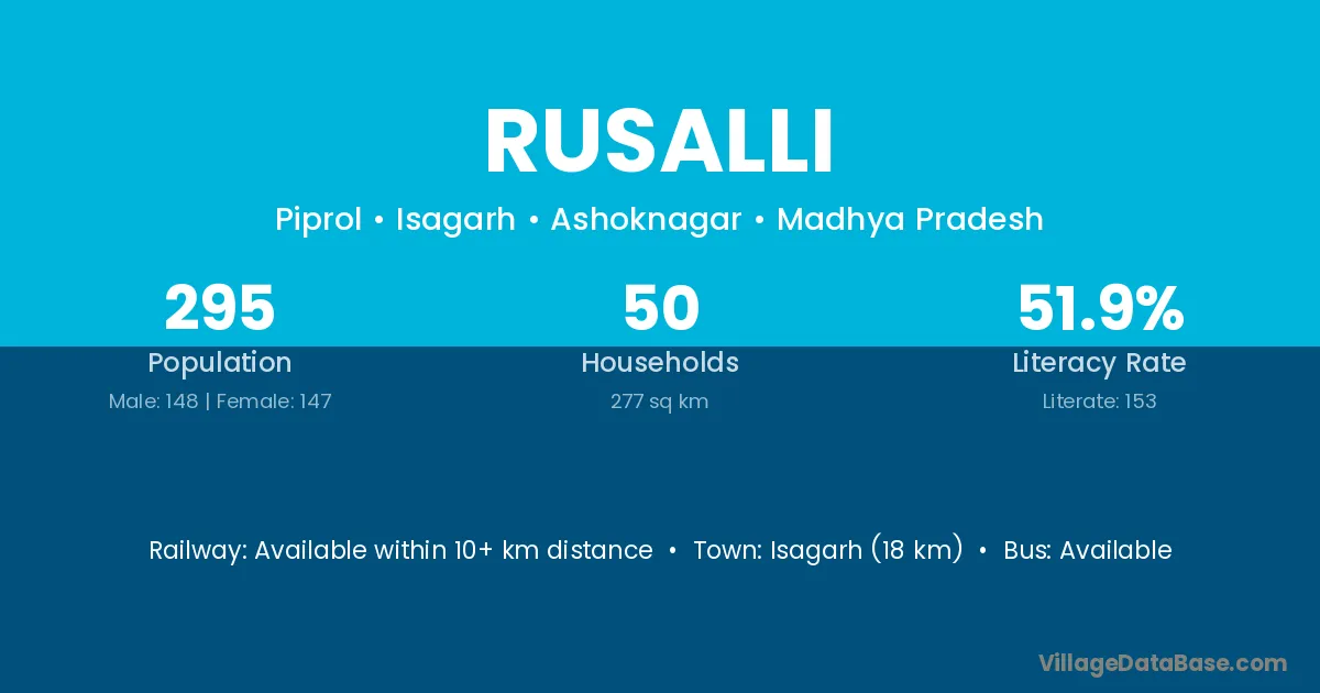 Mungaoli (19 km) is the nearest town to Rusalli village for major economic activities and is located approximately 19 km away.