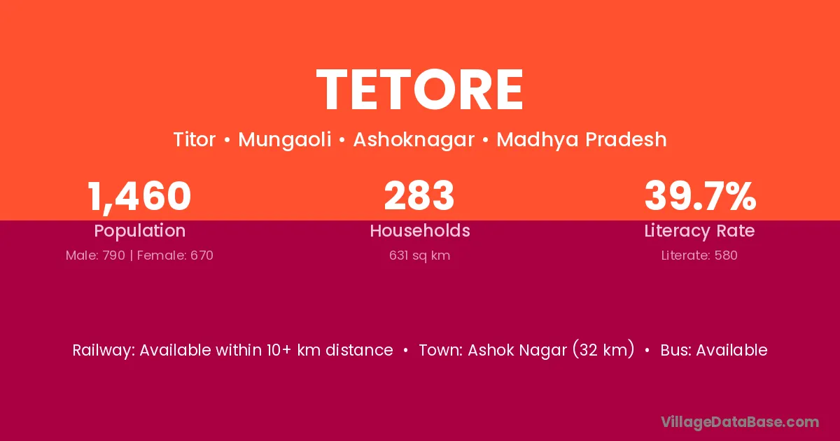 Ashok Nagar (32 km) is the nearest town to Tetore village for major economic activities and is located approximately 32 km away.