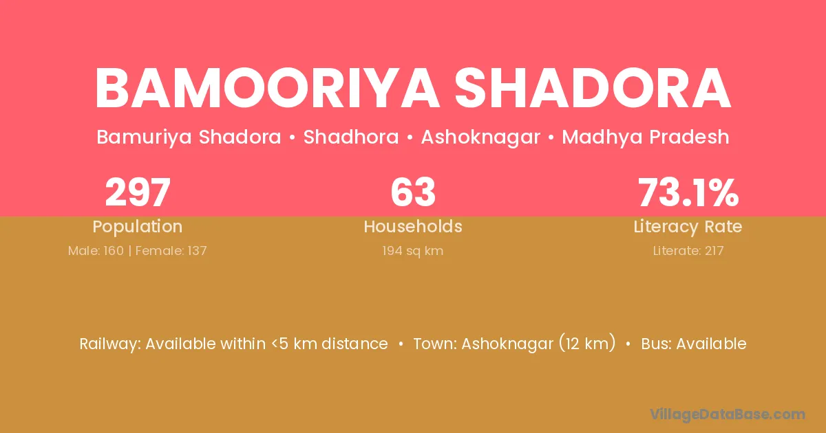Ashoknagar (12 km) is the nearest town to Bamooriya Shadora village for major economic activities and is located approximately 12 km away.