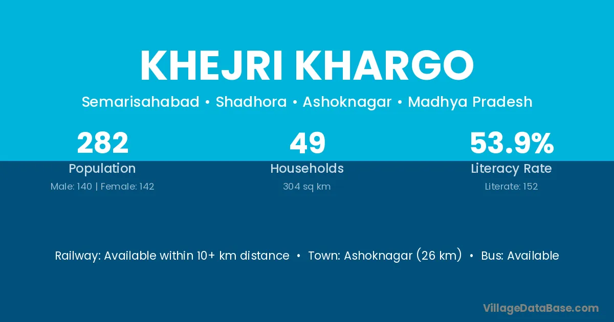 Ashoknagar (26 km) is the nearest town to Khejri Khargo village for major economic activities and is located approximately 26 km away.