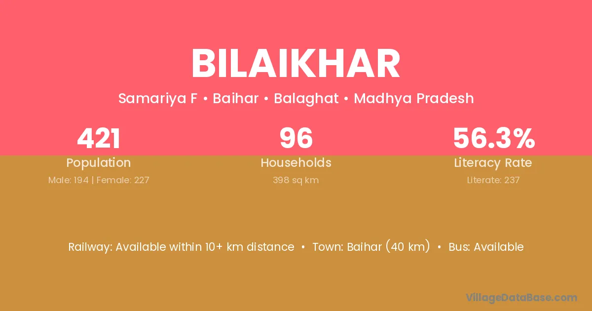 Baihar (40 km) is the nearest town to Bilaikhar village for major economic activities and is located approximately 40 km away.