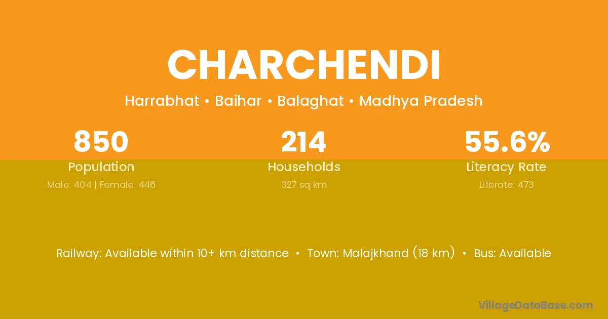 Malajkhand (18 km) is the nearest town to Charchendi village for major economic activities and is located approximately 18 km away.