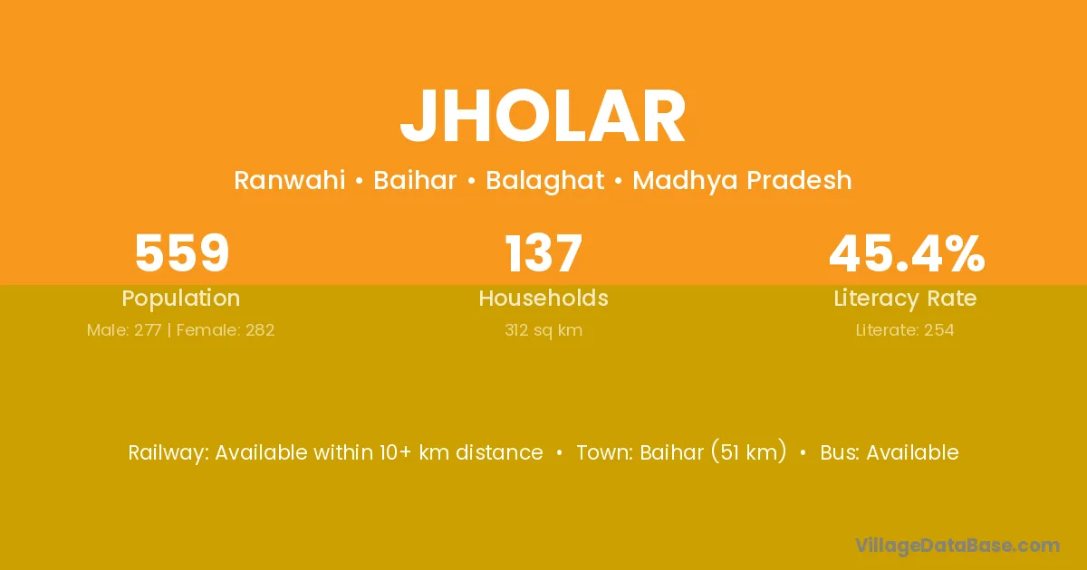 Baihar (51 km) is the nearest town to Jholar village for major economic activities and is located approximately 51 km away.