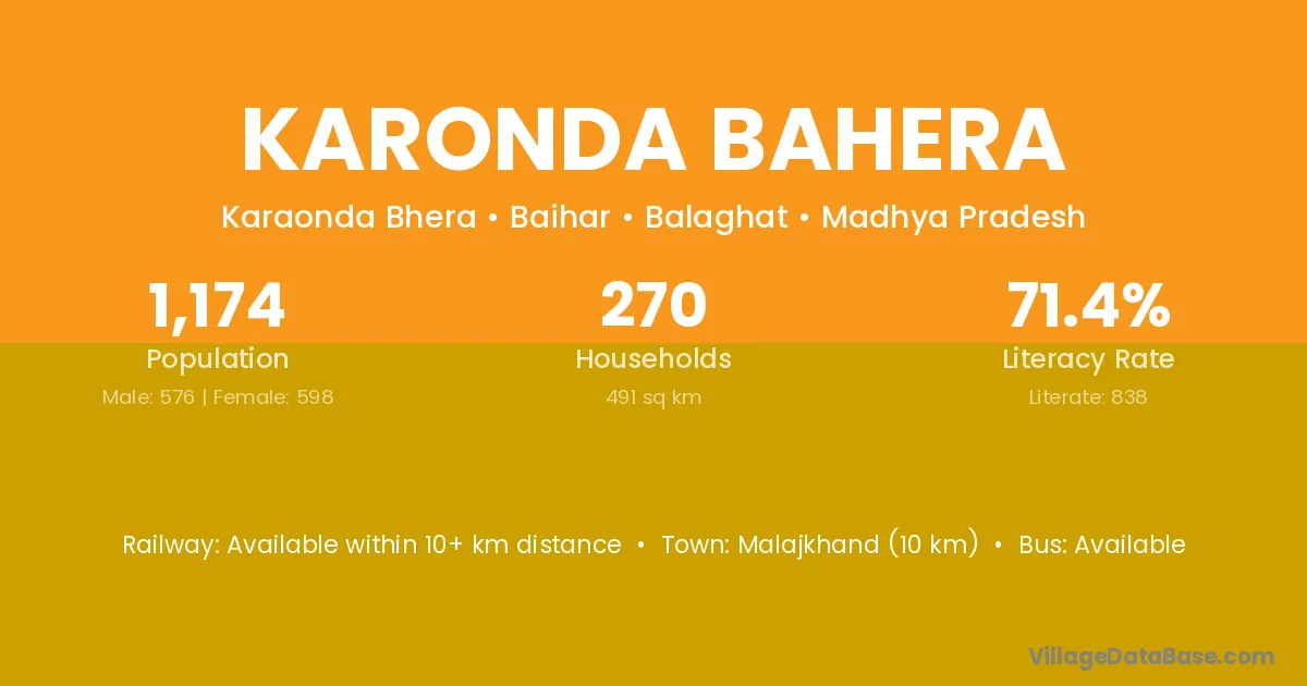 Malajkhand (10 km) is the nearest town to Karonda Bahera village for major economic activities and is located approximately 10 km away.