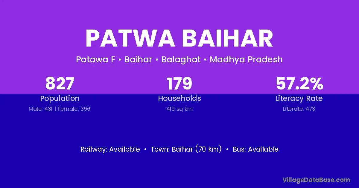 Patwa Baihar village has a total population of 827 people, of which 431 are males and 396 are females.