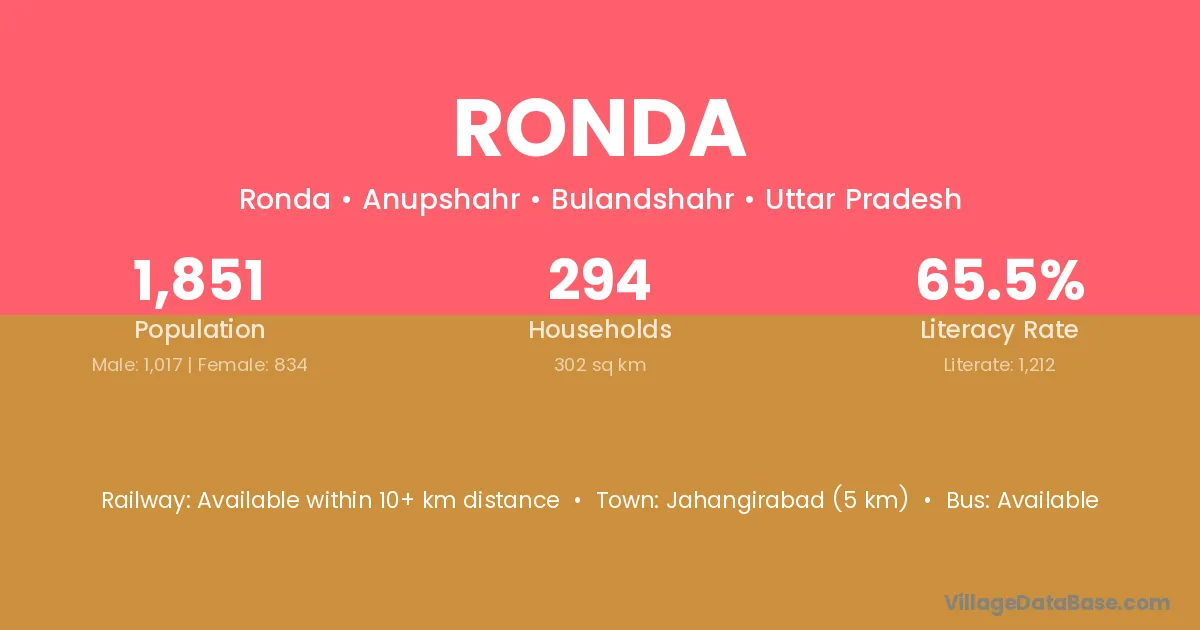 The literacy rate of Ronda village is 100.00%. Male literacy stands at 100.00% and female literacy at 100.00%.