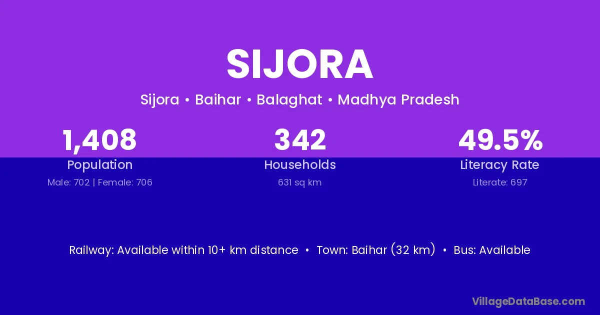 Baihar (32 km) is the nearest town to Sijora village for major economic activities and is located approximately 32 km away.