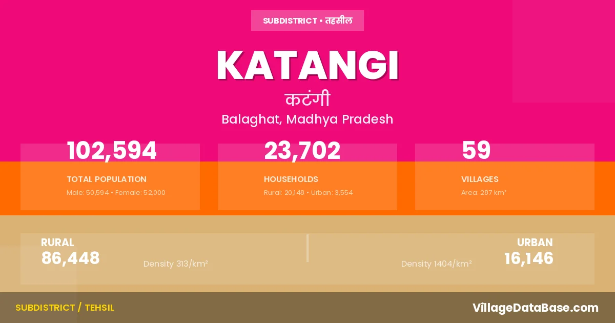 According to the 2011 census The total area of Katangi Tehsil is 287 km², with a population of 102594 people. The population density is 357 inhabitants per square kilometre, and there are approximately 23702 houses in the sub district.