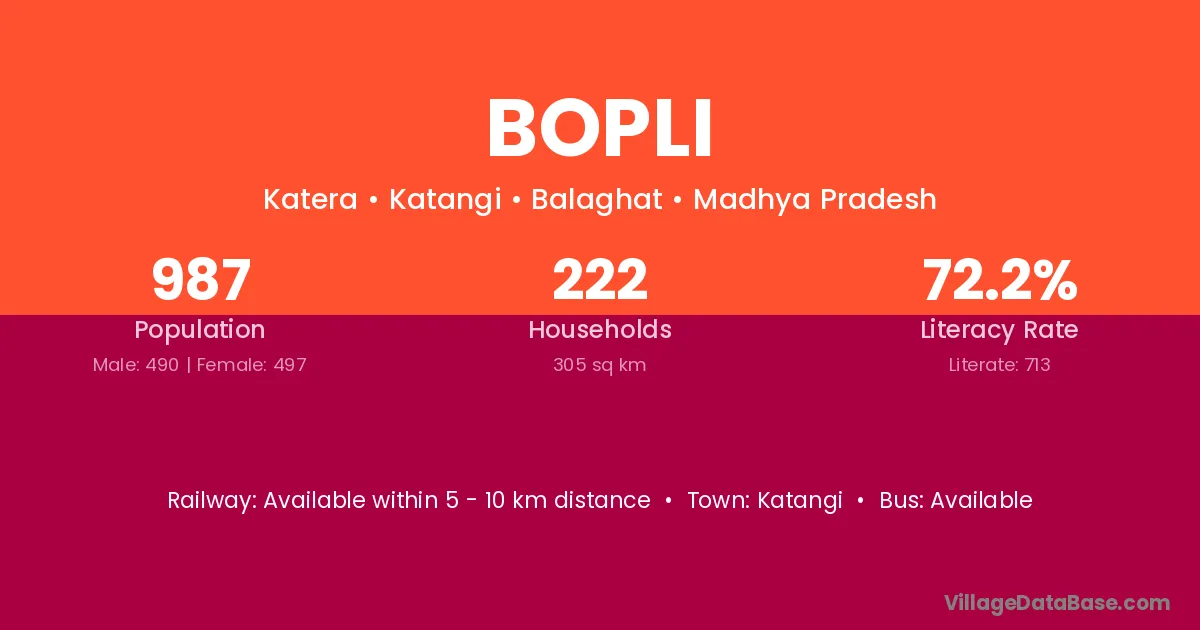Bopli village has a total population of 987 people, of which 490 are males and 497 are females.