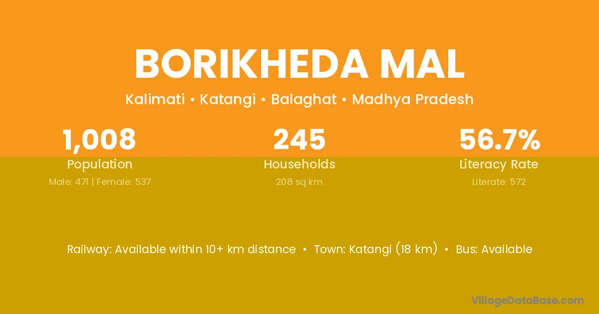 Katangi (18 km) is the nearest town to Borikheda Mal village for major economic activities and is located approximately 18 km away.