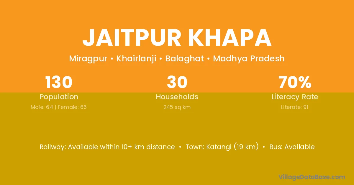 Katangi (19 km) is the nearest town to Jaitpur Khapa village for major economic activities and is located approximately 19 km away.