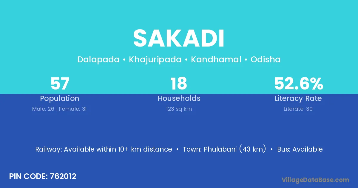 The literacy rate of Sakadi village is 58.75%. Male literacy stands at 66.41% and female literacy at 51.24%.