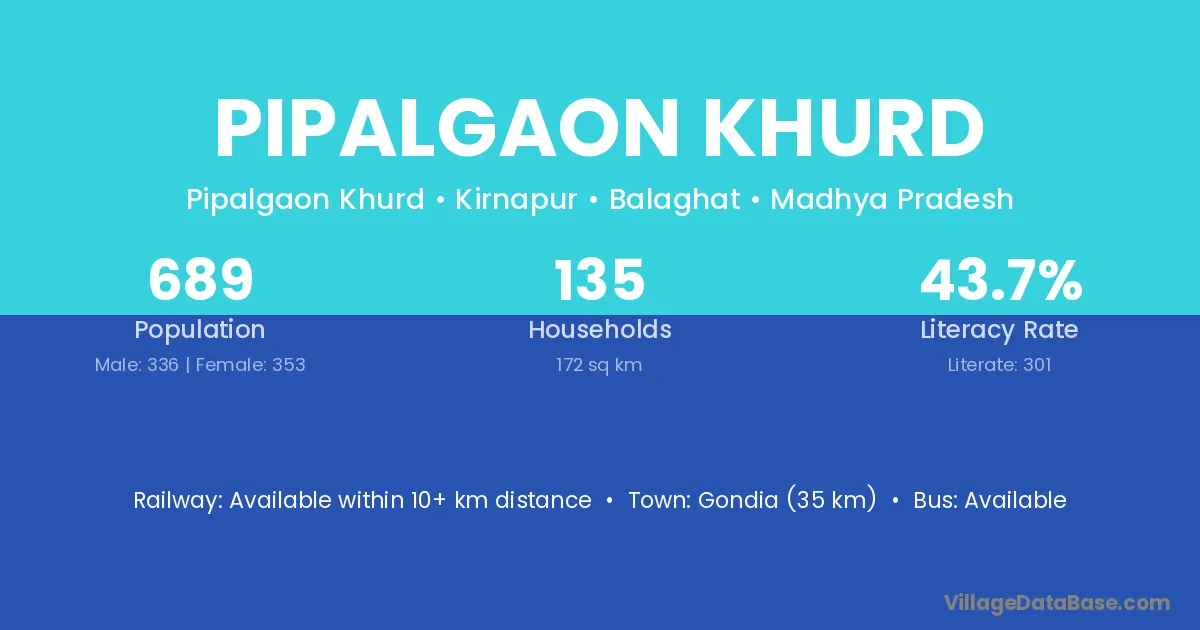 Pipalgaon Khurd village has a total population of 689 people, of which 336 are males and 353 are females.