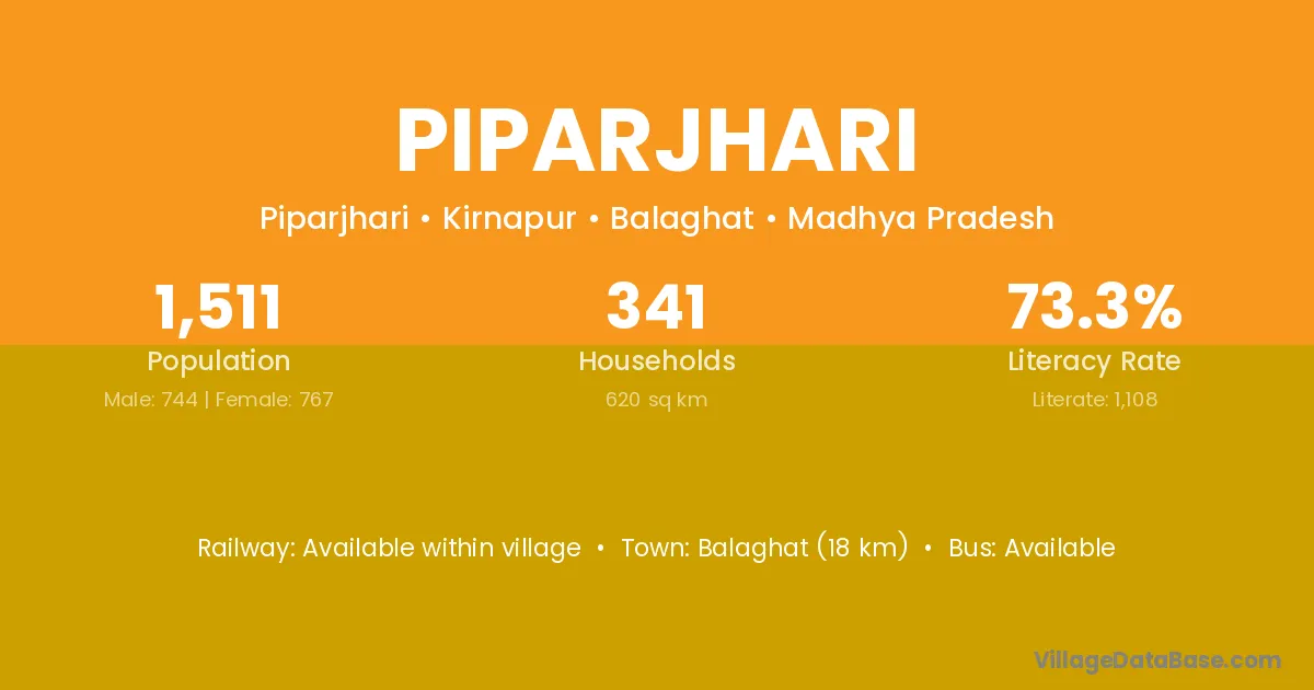 Balaghat (18 km) is the nearest town to Piparjhari village for major economic activities and is located approximately 18 km away.