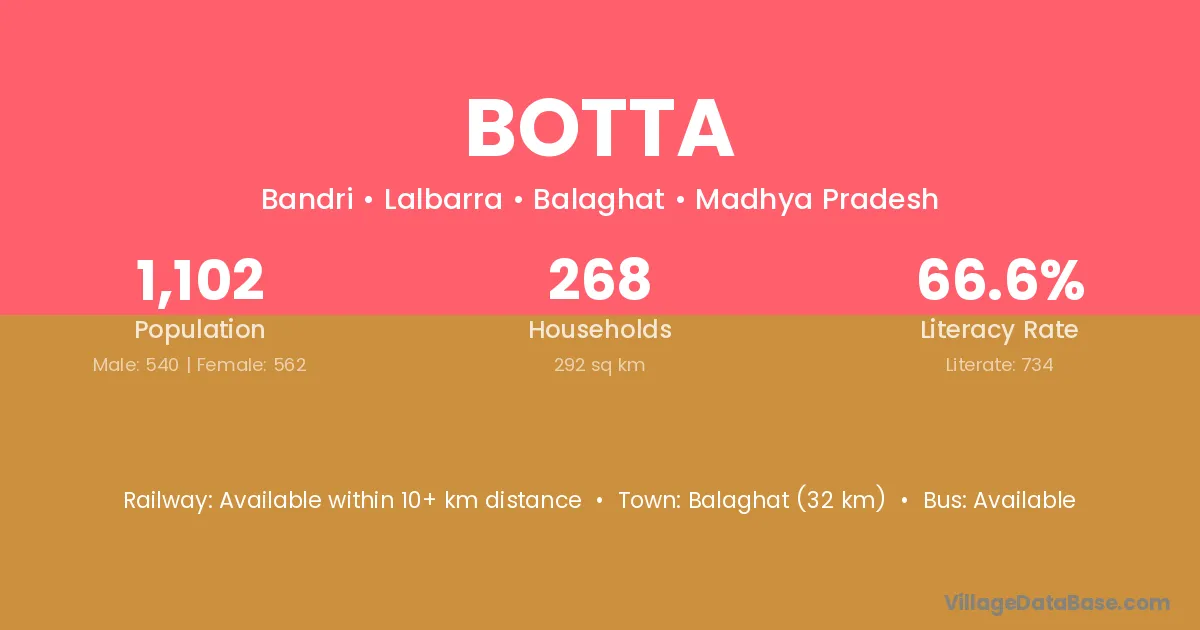 Balaghat (32 km) is the nearest town to Botta village for major economic activities and is located approximately 32 km away.