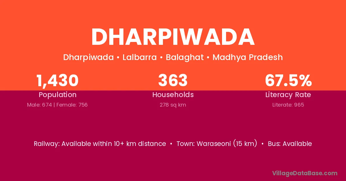 Waraseoni (15 km) is the nearest town to Dharpiwada village for major economic activities and is located approximately 15 km away.