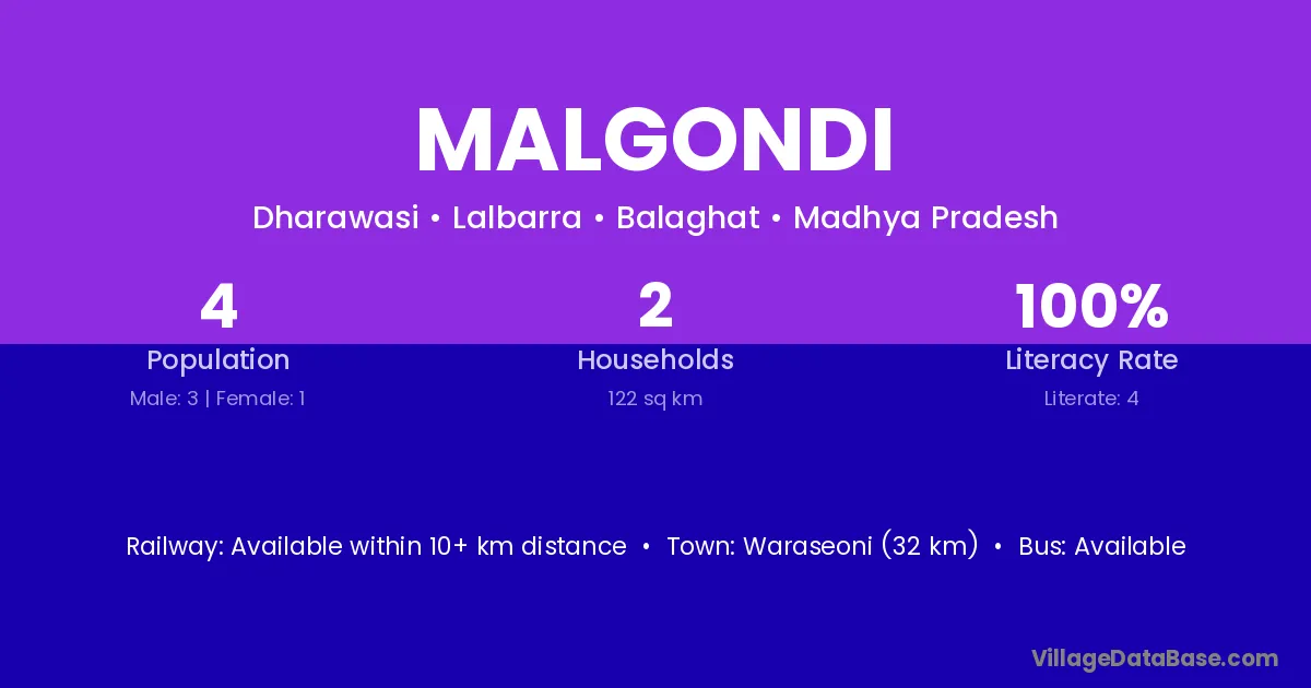 Waraseoni (32 km) is the nearest town to Malgondi village for major economic activities and is located approximately 32 km away.
