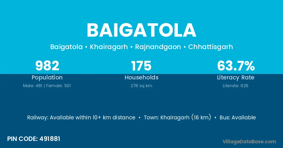 Lanji (37 km) is the nearest town to Baigatola village for major economic activities and is located approximately 37 km away.