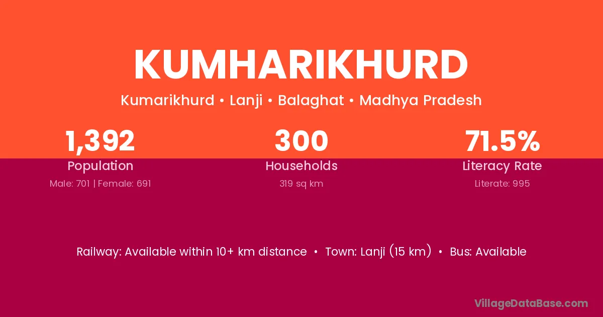 Lanji (15 km) is the nearest town to Kumharikhurd village for major economic activities and is located approximately 15 km away.