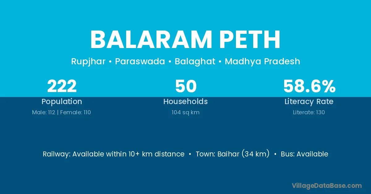 Baihar (34 km) is the nearest town to Balaram Peth village for major economic activities and is located approximately 34 km away.