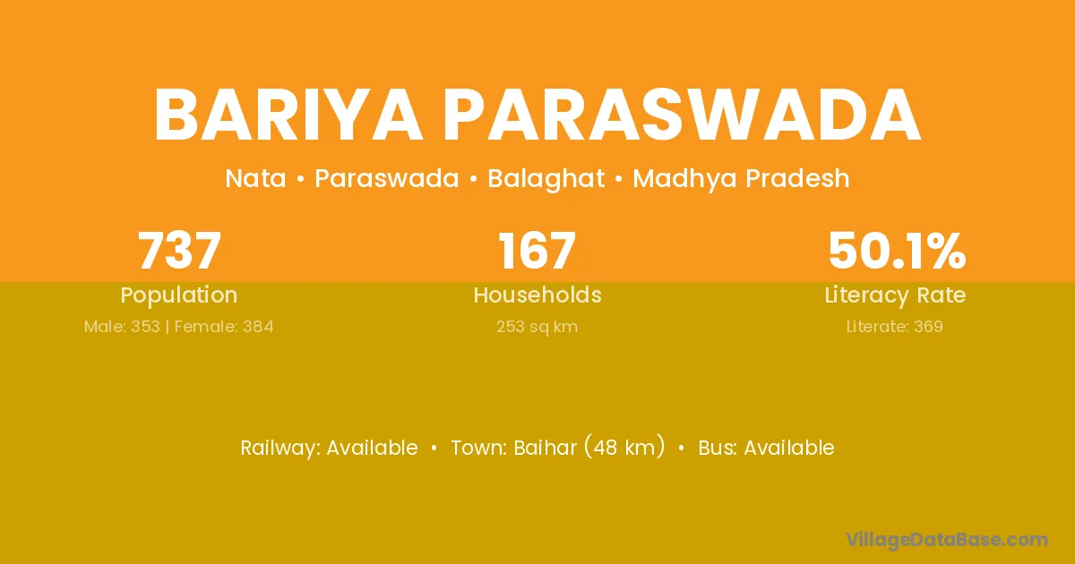 Baihar (48 km) is the nearest town to Bariya Paraswada village for major economic activities and is located approximately 48 km away.