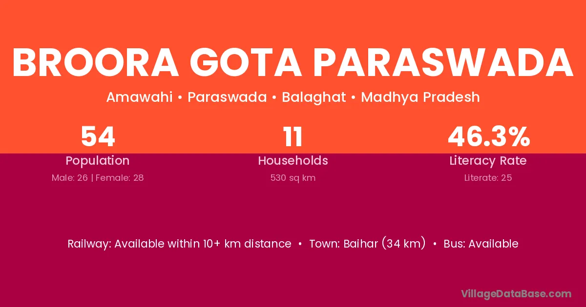 Baihar (34 km) is the nearest town to Broora Gota Paraswada village for major economic activities and is located approximately 34 km away.