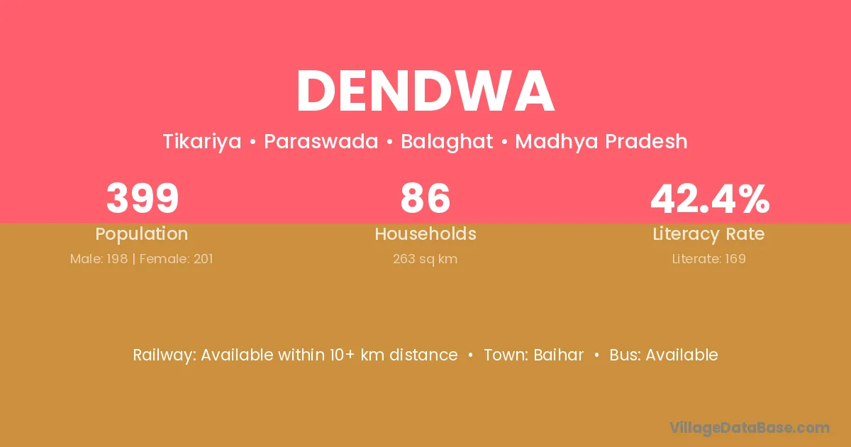 Dendwa village has a total population of 399 people, of which 198 are males and 201 are females.