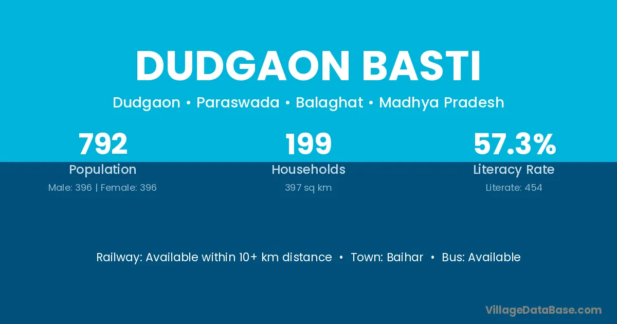 Dudgaon Basti village has a total population of 792 people, of which 396 are males and 396 are females.