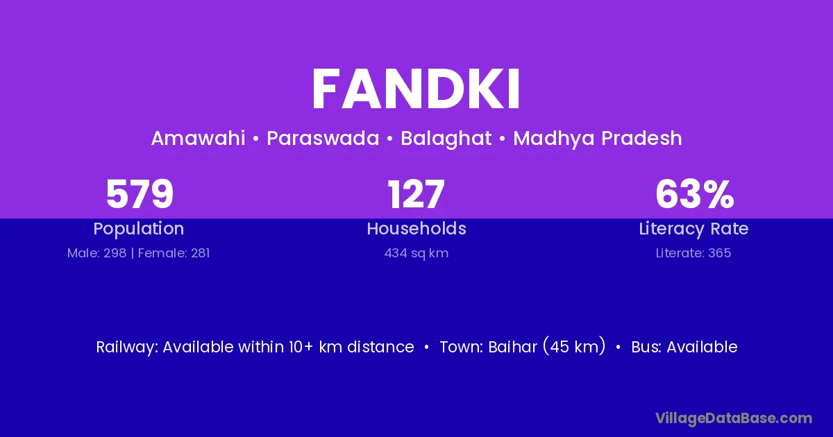 Baihar (45 km) is the nearest town to Fandki village for major economic activities and is located approximately 45 km away.