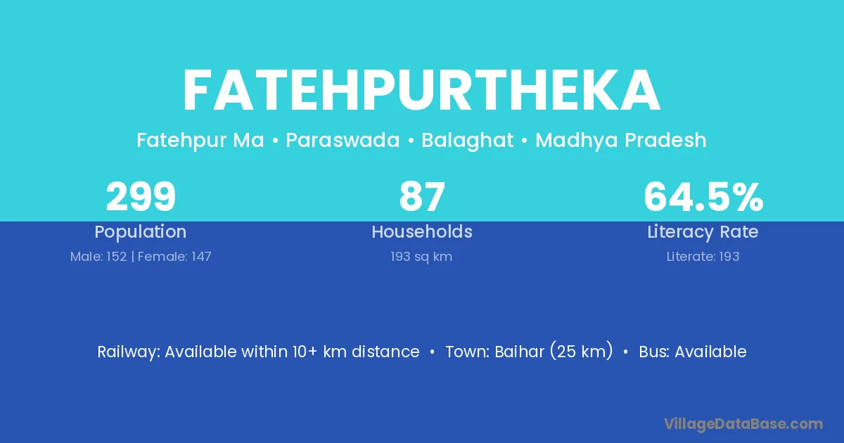Baihar (25 km) is the nearest town to Fatehpurtheka village for major economic activities and is located approximately 25 km away.