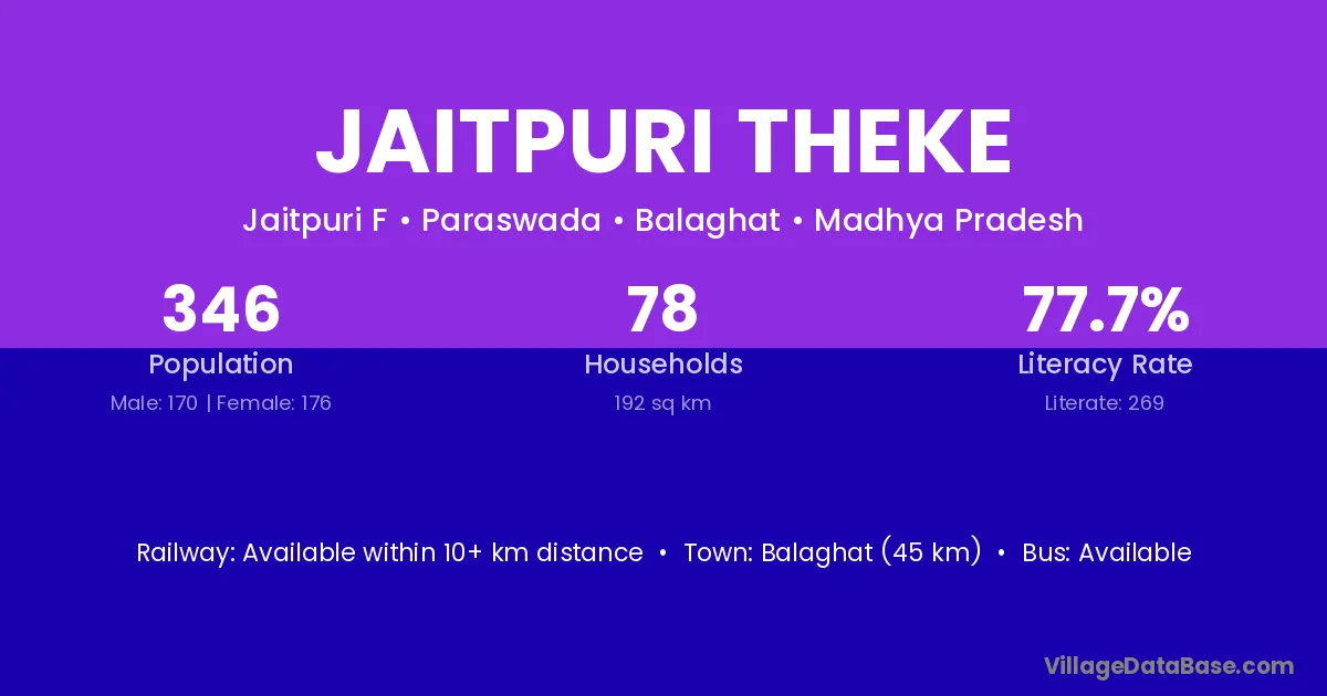 Balaghat (45 km) is the nearest town to Jaitpuri Theke village for major economic activities and is located approximately 45 km away.