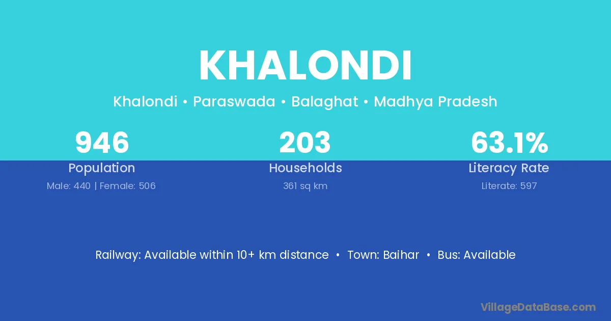 Khalondi village has a total population of 946 people, of which 440 are males and 506 are females.