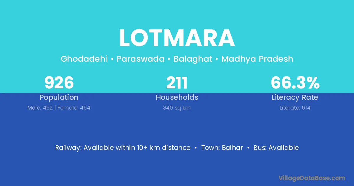 Lotmara village has a total population of 926 people, of which 462 are males and 464 are females.