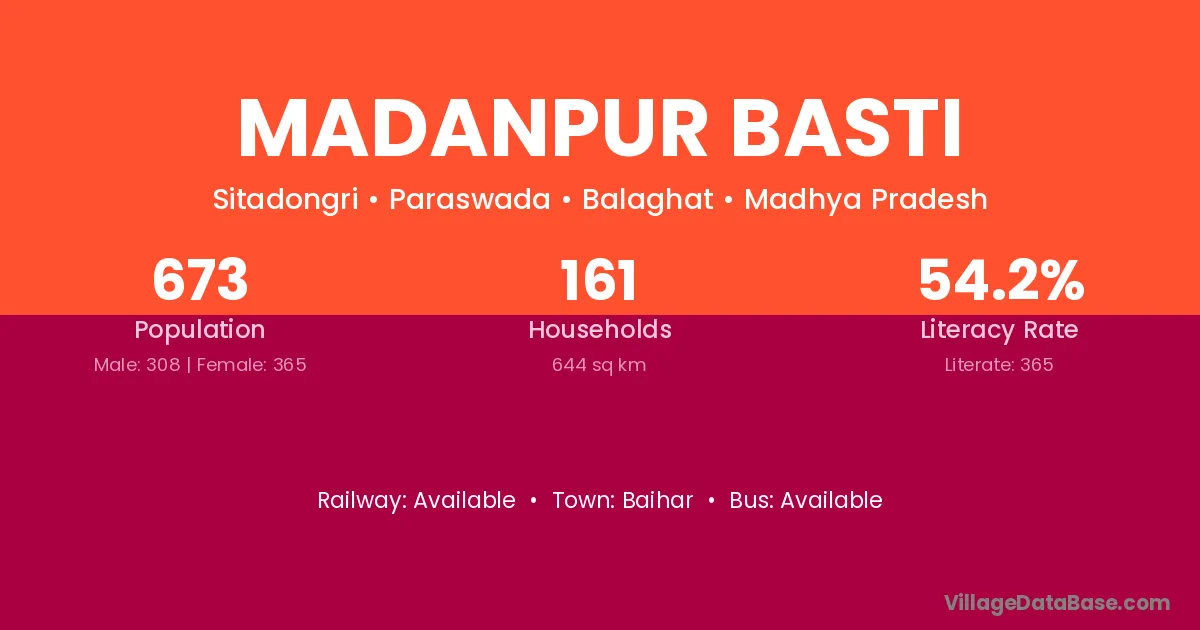 Madanpur Basti village has a total population of 673 people, of which 308 are males and 365 are females.
