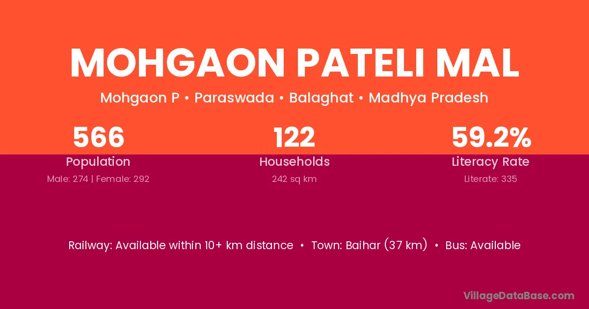 Baihar (37 km) is the nearest town to Mohgaon Pateli Mal village for major economic activities and is located approximately 37 km away.