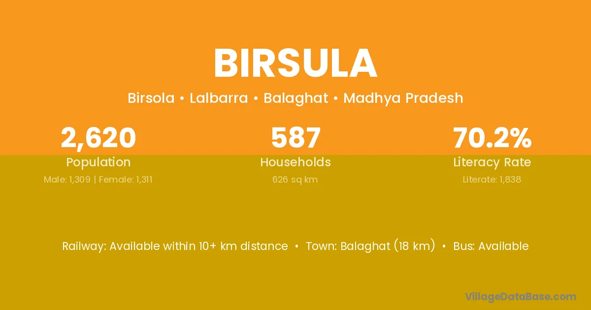 Katangi (15 km) is the nearest town to Birsula village for major economic activities and is located approximately 15 km away.