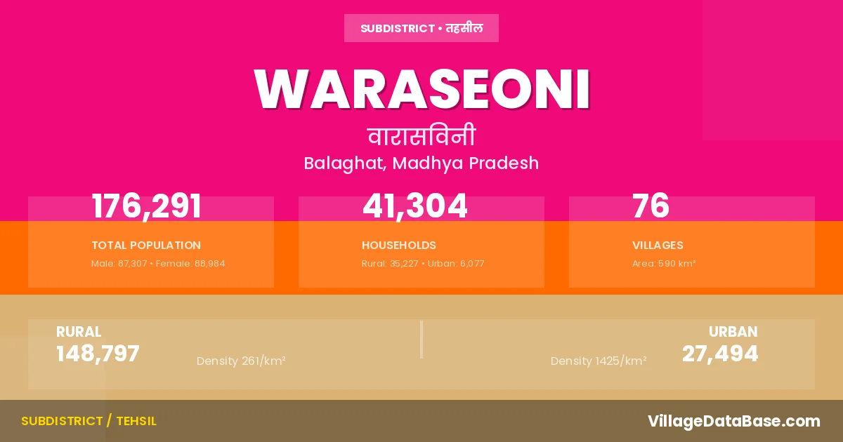According to the 2011 census The total area of Waraseoni Tehsil is 590 km², with a population of 176291 people. The population density is 299 inhabitants per square kilometre, and there are approximately 41304 houses in the sub district.