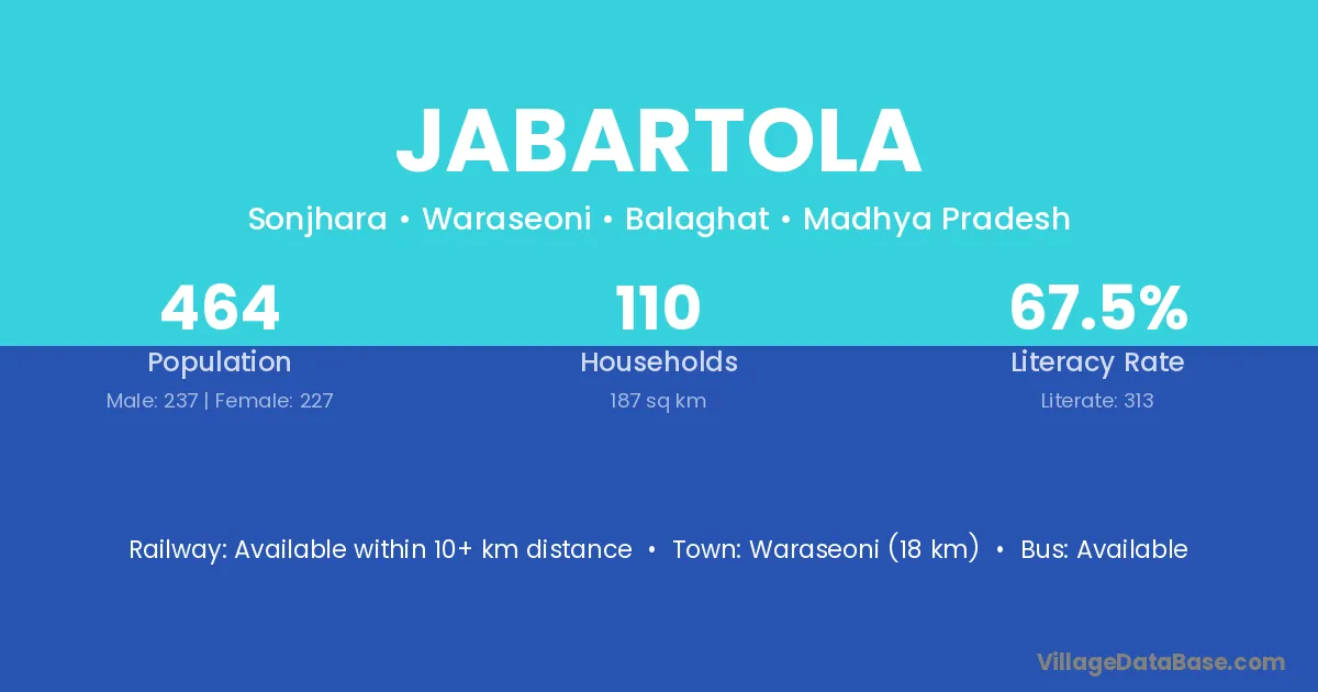 Waraseoni (18 km) is the nearest town to Jabartola village for major economic activities and is located approximately 18 km away.