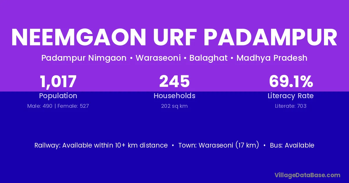 Neemgaon Urf Padampur village has a total population of 1,017 people, of which 490 are males and 527 are females.