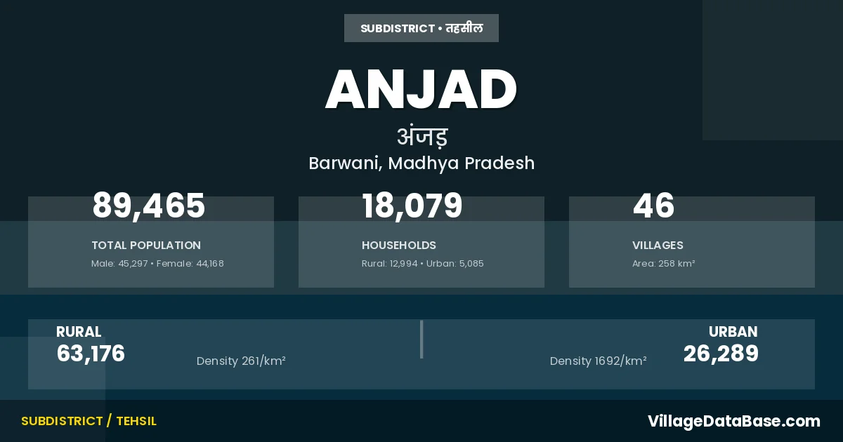 According to the 2011 census The total area of Anjad Tehsil is 258 km², with a population of 89465 people. The population density is 347 inhabitants per square kilometre, and there are approximately 18079 houses in the sub district.