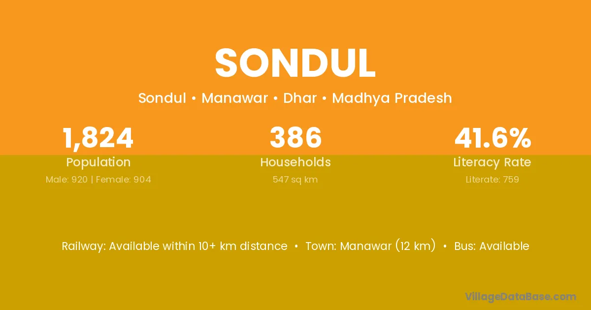 Barwani (12 km) is the nearest town to Sondul village for major economic activities and is located approximately 12 km away.