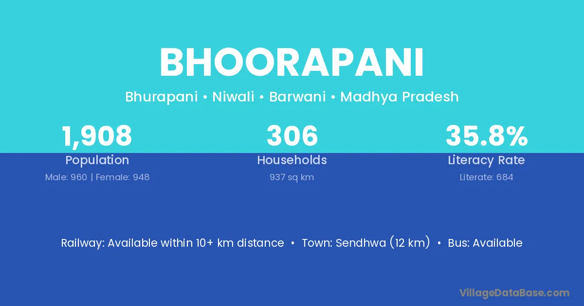 Sendhwa (12 km) is the nearest town to Bhoorapani village for major economic activities and is located approximately 12 km away.
