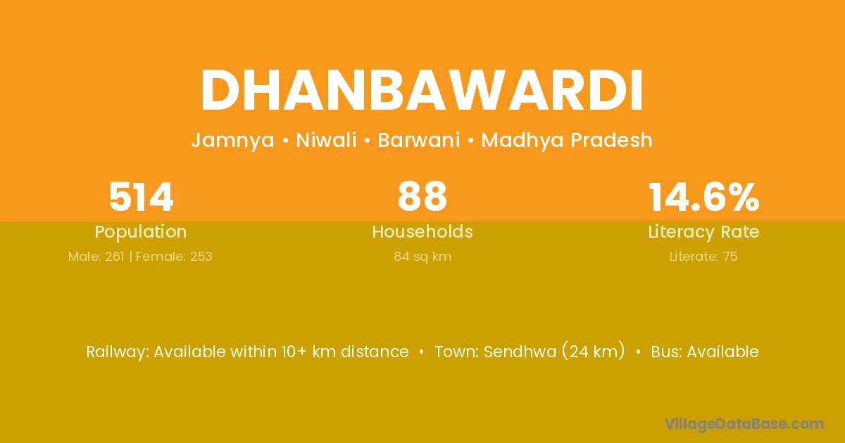 Sendhwa (24 km) is the nearest town to Dhanbawardi village for major economic activities and is located approximately 24 km away.