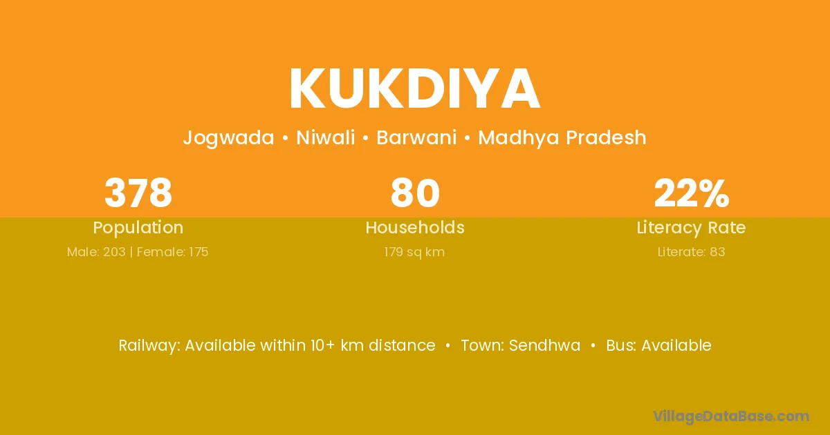 Kukdiya village has a total population of 378 people, of which 203 are males and 175 are females.