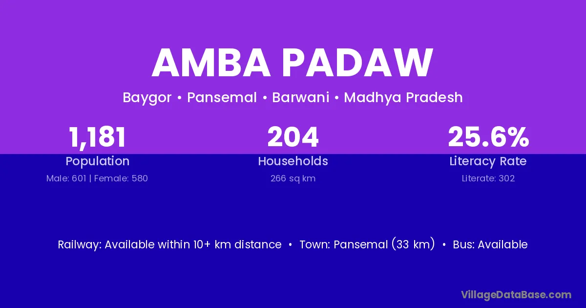 Amba Padaw village has a total population of 1,181 people, of which 601 are males and 580 are females.