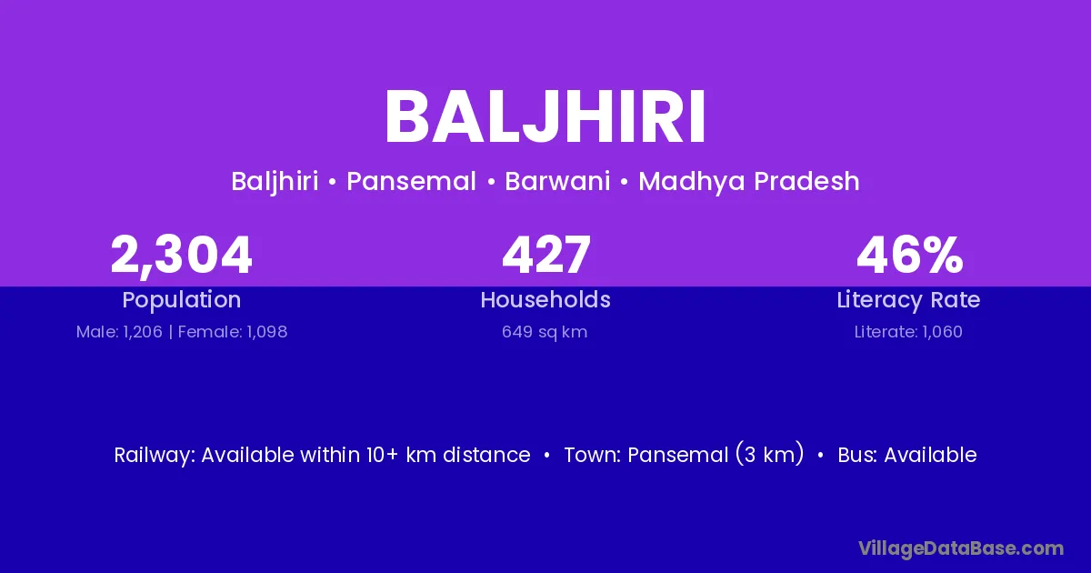 Baljhiri village has a total population of 2,304 people, of which 1,206 are males and 1,098 are females.