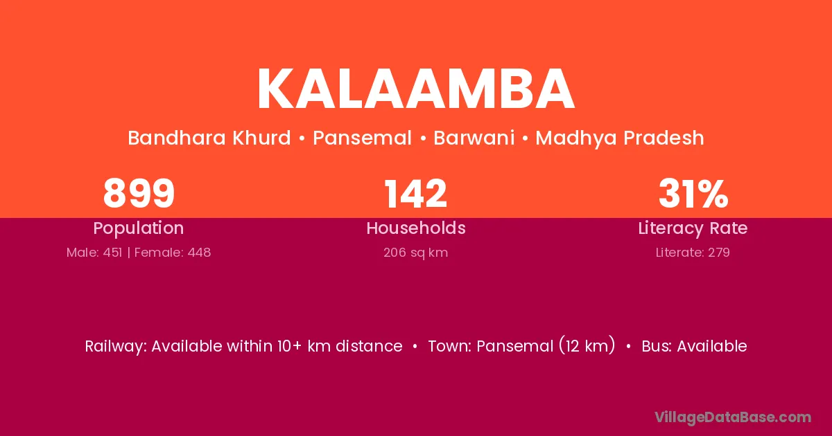 Kalaamba village has a total population of 899 people, of which 451 are males and 448 are females.