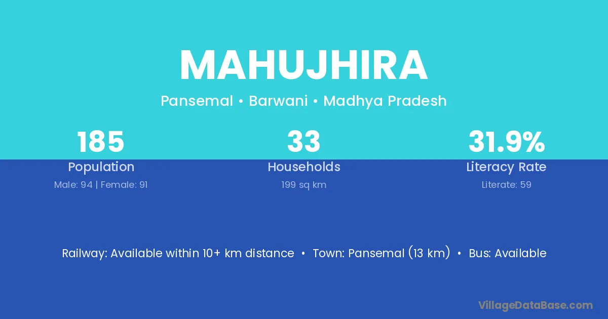 Mahujhira village has a total population of 185 people, of which 94 are males and 91 are females.