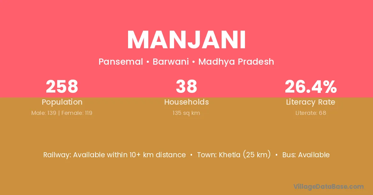 Khetia (25 km) is the nearest town to Manjani village for major economic activities and is located approximately 25 km away.
